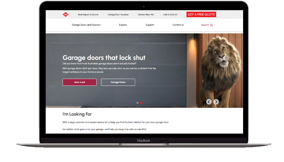 Choosing the right garage door is a major design decision for homeowners and builders, but visualising how a door style or colour will look on a particular home can be difficult. B&D wanted a modern, interactive digital experience that removed uncertainty from the selection process by allowing users to preview garage door combinations in real-time. Their existing website did not offer this level of interactivity, nor was it optimised for compatibility across modern desktop and mobile devices. They needed a digital solution that not only elevated the customer journey but also strengthened lead generation through seamless handoff to B&D dealers.